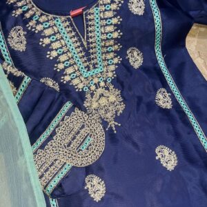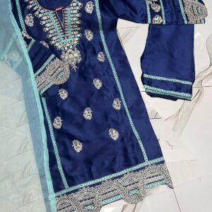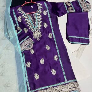 Neck, Sleeves Border Embroidery With Kayawork Shirt And Emb Trouser With Plain Contrast Dupatta Kids 3Pcs